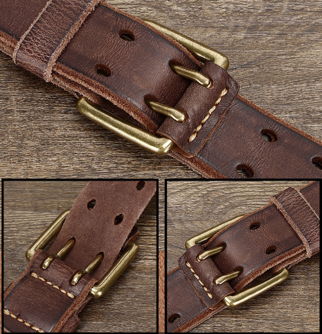 Vintage Men’s Italian Full Grain Leather Belt Holes Free with Double Pins Buckle 4.0cm